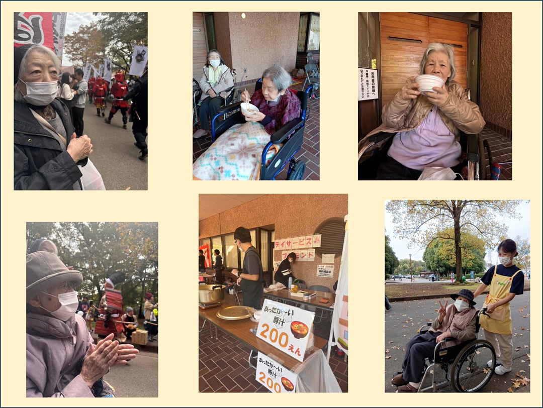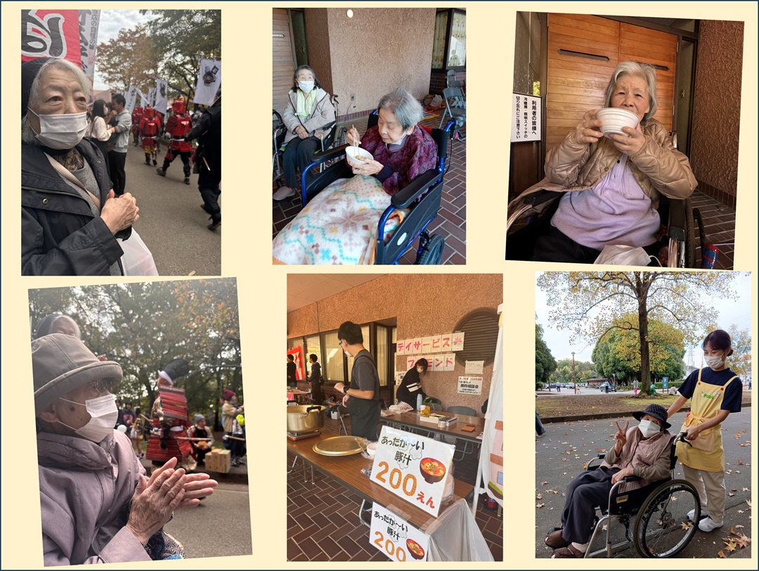 利用者さんも職員と一緒に遊びに来てくださり、あたたかい豚汁を召し上がって笑顔を見せてくださいました。